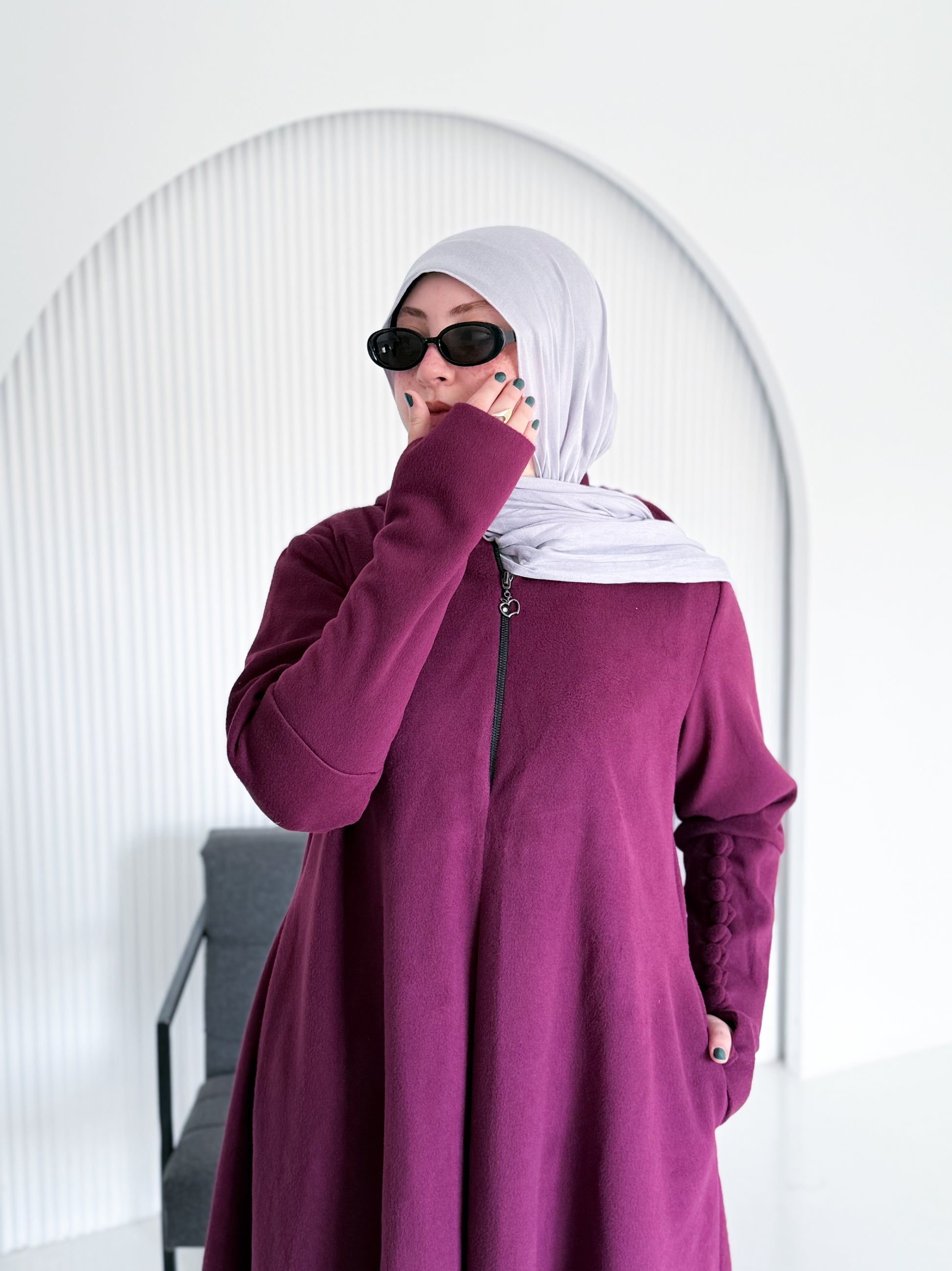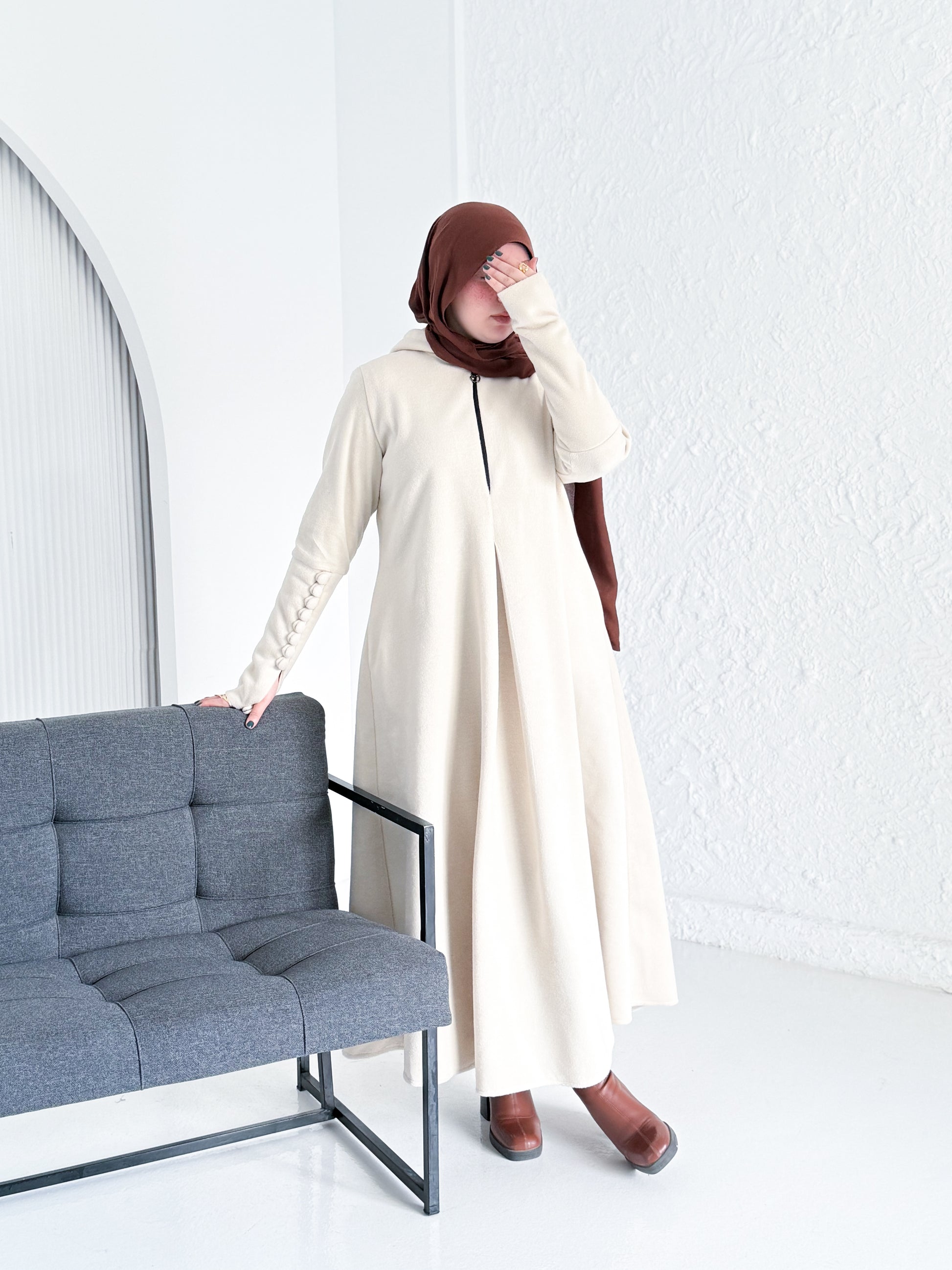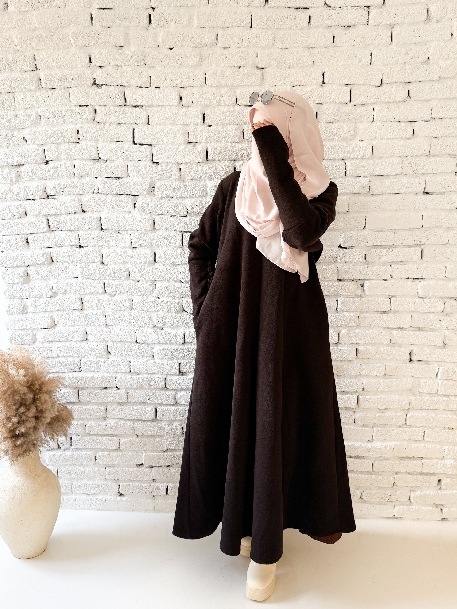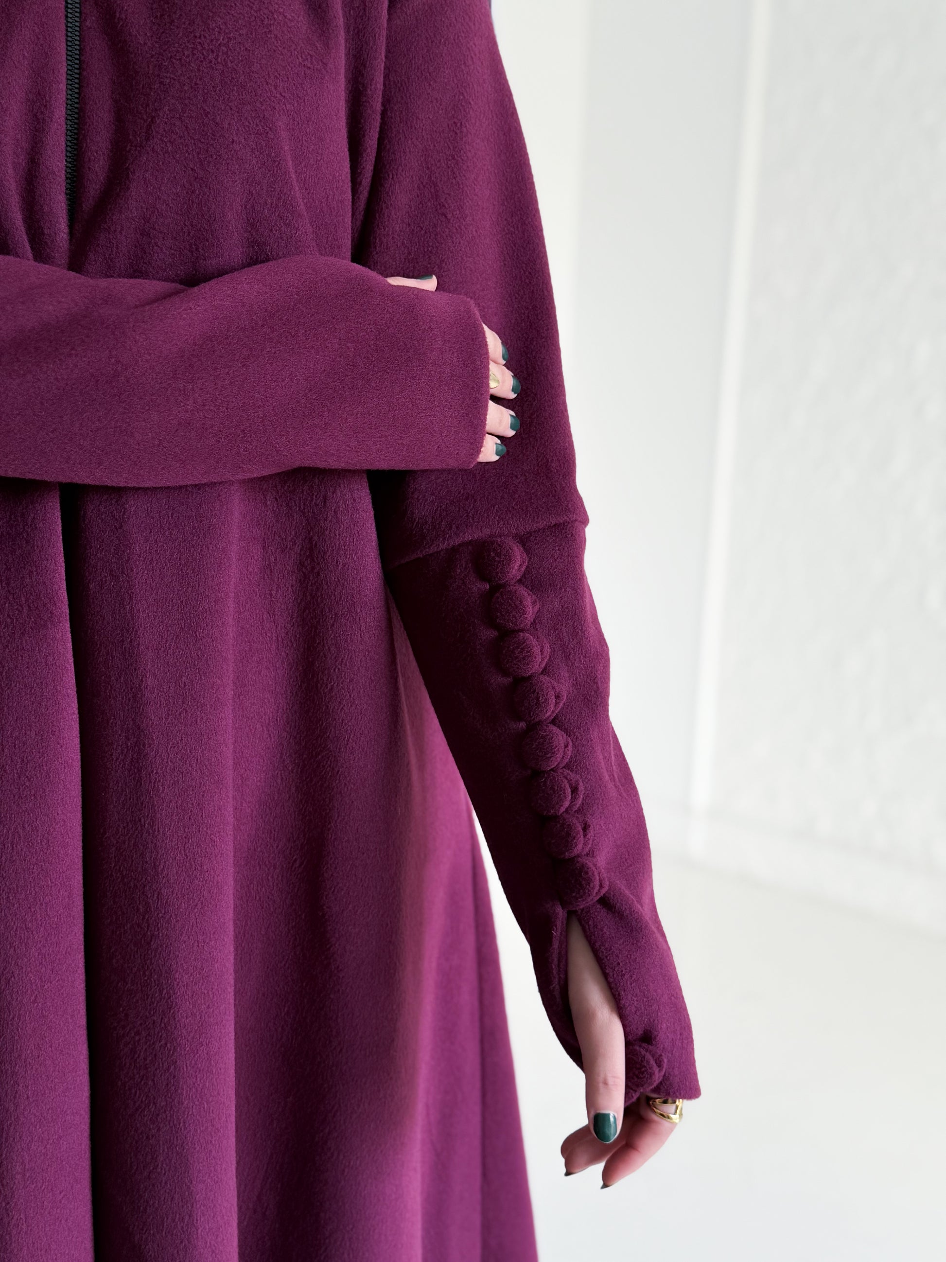 الأكمام مزودة بأزرار تمنح شكل معصم أنيق وتساعد على تدفئة اليد، ليكون التصميم متكاملًا في التفاصيل.